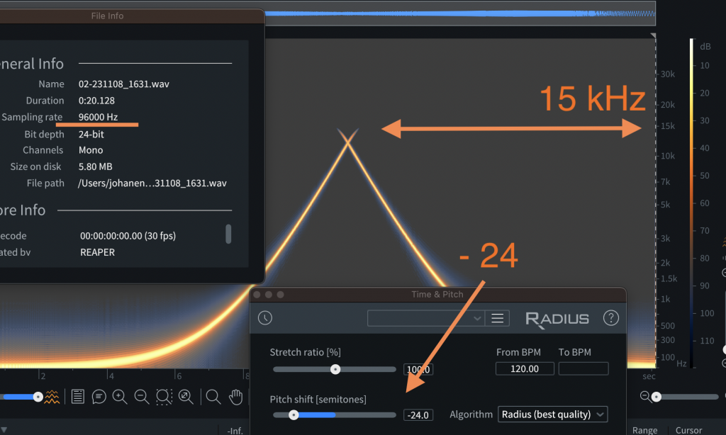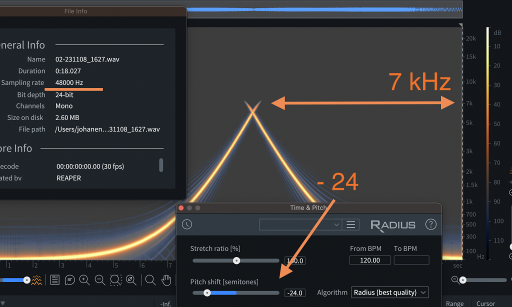 But both of these are playing back the lower pitch by slowing the speed so instead let’s use a pitch shifting algorithm. Both files have had a -24 semitone pitch shift process applied and below is the visual and audible result of that process.